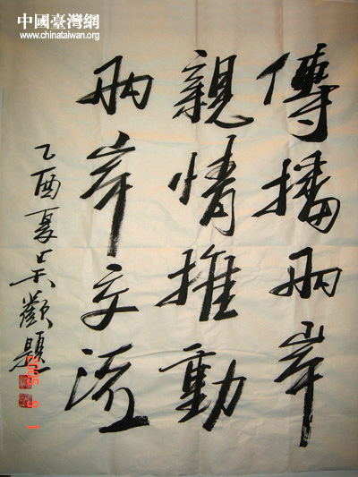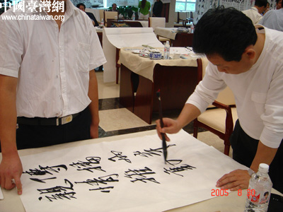 會上,應本網記者要求,著名華人書畫家吳歡先生為本網題詞:“傳播兩岸親情 推動兩岸交流。”吳歡先生還詳細詢問了中國臺灣網的各項主要功能,並祝願中國臺灣網為兩岸的和平統一大業作出更大的貢獻。