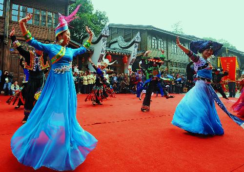 Actors from Guizhou Province perform at the cross-Strait Folk Art Carnival in Fuzhou, capital of southeast China's Fujian Province, Jan. 31, 2010. Folk art groups from Chinese mainland and Taiwan attended the carnival which opended on Sunday. (Xinhua/Zhang Guojun) |