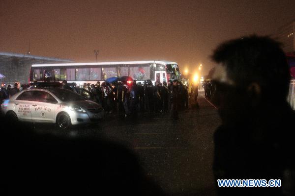 Policemen secure the site after a hostage-taker opened fire from inside a tourist bus full of Hong Kong tourists during a hostage crisis in Manila Aug. 23, 2010. (Xinhua/Rouelle Umali)