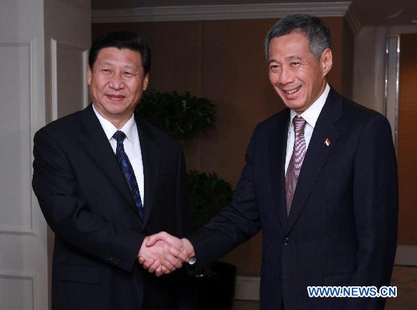 Chinese Vice President Xi Jinping (L) shakes hands with Singaporean Prime Minister Lee Hsien Loong during their meeting in Singapore, on Nov. 15, 2010. (Xinhua/Huang Jingwen)