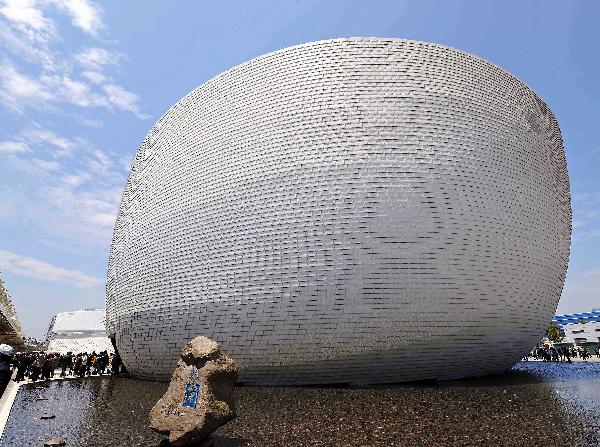 Photo taken on April 25, 2010 shows the exterior of the Finland pavilion in the World Expo Park in Shanghai, east China. The Finland pavilion "Kirnu" ("Giant's Kettle") is surrounded by a lake, appearing to float on the water. It has the slogan "Sharing Inspiration," where ideas can meet and mix. The design draws inspiration from Finland nature. (Xinhua/Chen Shugen)