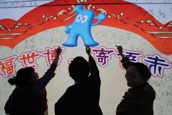 Local citizens sign on a wall to welcome the 2010 Shanghai World Expo at the square before Potala Palace in Lhasa, April 28, 2010. An activity greeting the 2010 Shanghai World Expo was held in Lhasa on Wednesday. (Xinhua/Chogo)