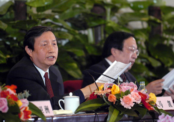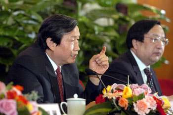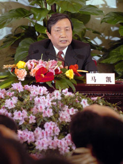 Ma Kai (L), minister in charge of the National Development and Reform Commission, adresses the media during a press conference on the Fourth Session of the Tenth National People's Congress (NPC) in Beijing on March 6, 2006. [Xinhua Photo]