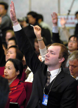 A journalist raises his hand for a chance to ask questions during a press conference held by the Fourth Session of the Tenth National People's Congress (NPC) in Beijing, capital of China, March 6, 2006. [Xinhua Photo]