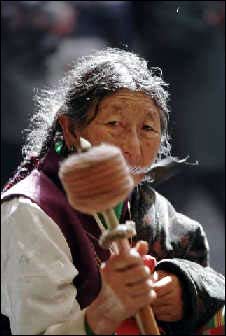 來自四川甘孜藏族自治州的老阿媽手搖轉經筒在大昭寺祈禱吉祥