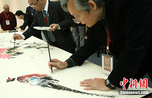 10月8日,來自中國臺灣、中國香港、中國澳門和中國大陸的兩岸四地以及海外華人等百位藝術家匯聚北京中國美術館參加《百年風雲·壯志丹青——紀念辛亥革命100周年美術作品展》筆會,臺灣著名畫家劉國松、羅青、劉昌漢李奇茂,澳門著名畫家孫蔣濤、劉富業、林冬梅,香港著名畫家司徒乃鐘、林湖奎以及大陸著名畫家、書法家匯聚一堂揮毫作畫紀念辛亥革命100周年。中新社發 錢興強 攝