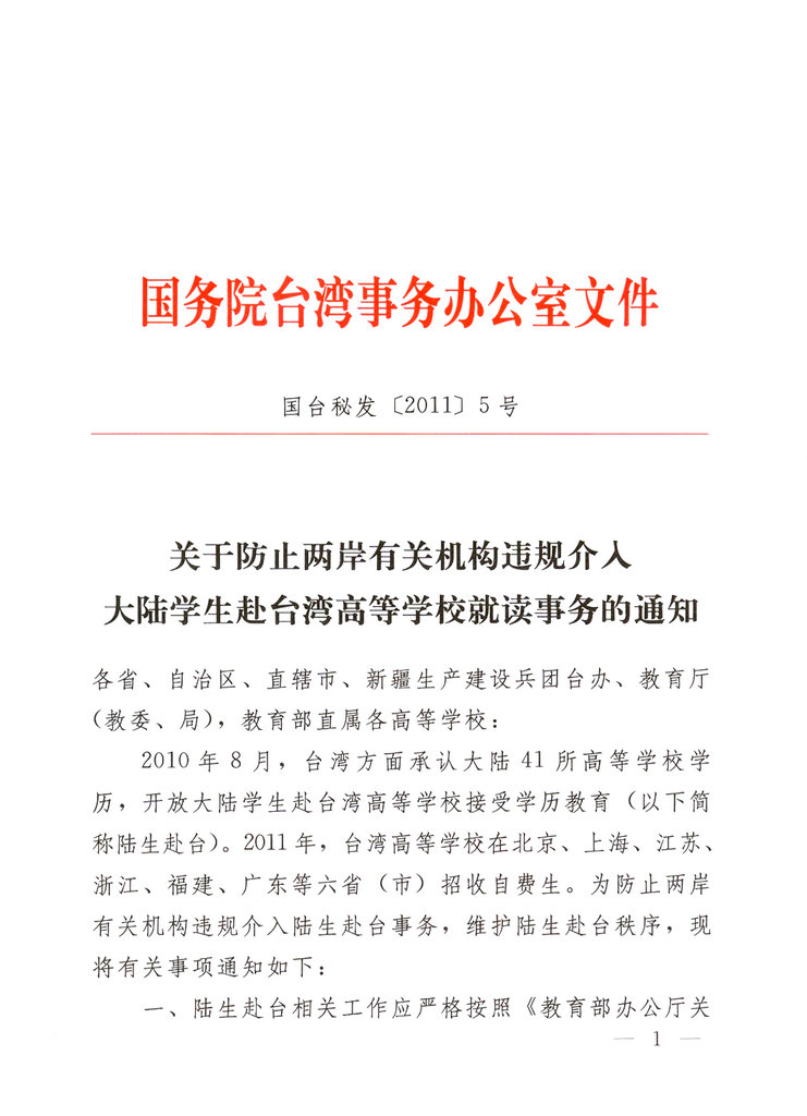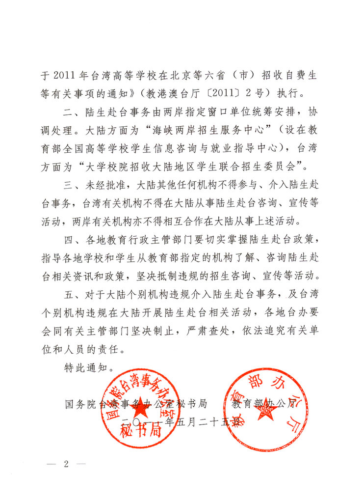 兩部門要求防止兩岸機構違規介入陸生赴臺事務