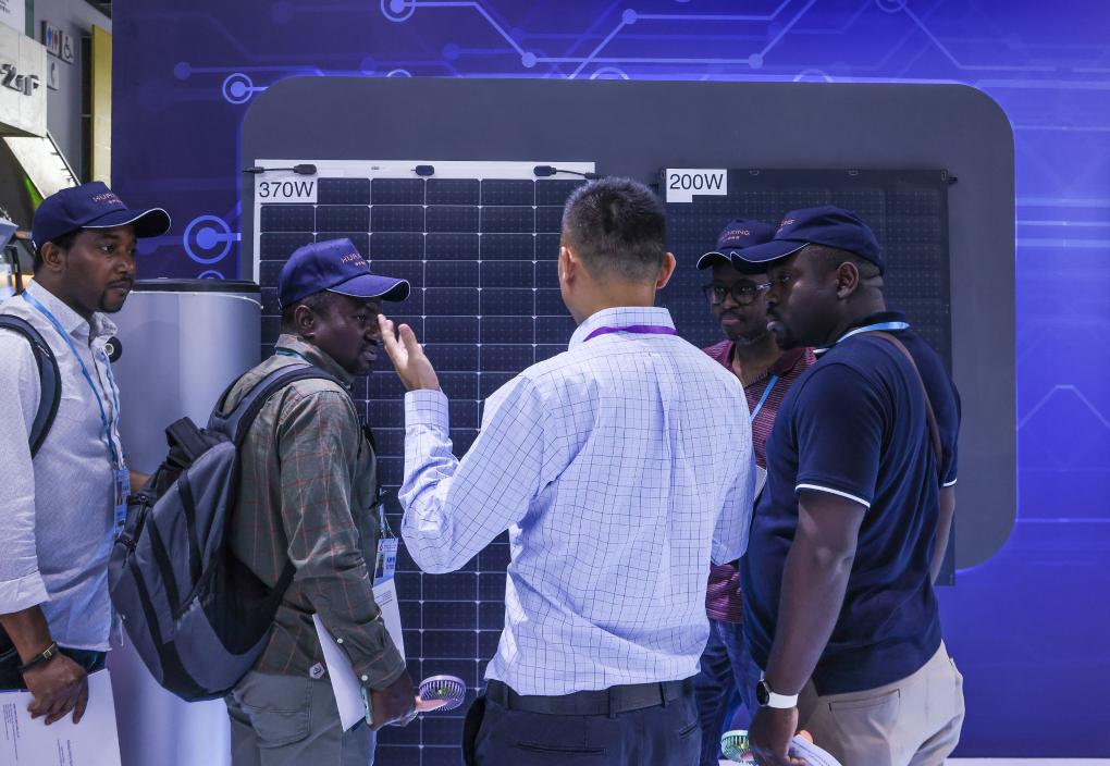 4月15日,參展商在第135屆廣交會上向採購商介紹太陽能電池組件展品。新華社記者 劉大偉 攝