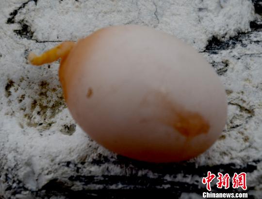 這枚雞蛋的一端,有一段黃色的類似尾巴狀物體,摸起來還有些柔軟,產下這枚蛋的是一只黃色新母雞。