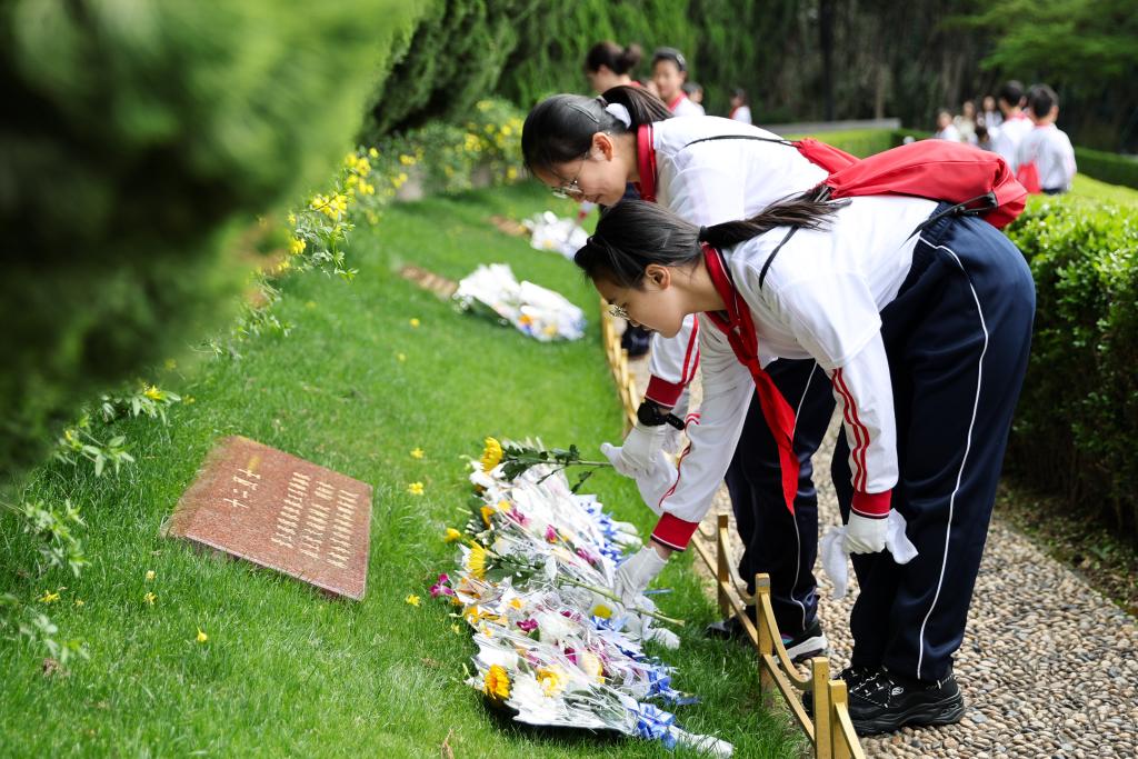 4月4日,少先隊員在上海龍華烈士陵園烈士墓碑區域獻花。新華社記者 王翔 攝