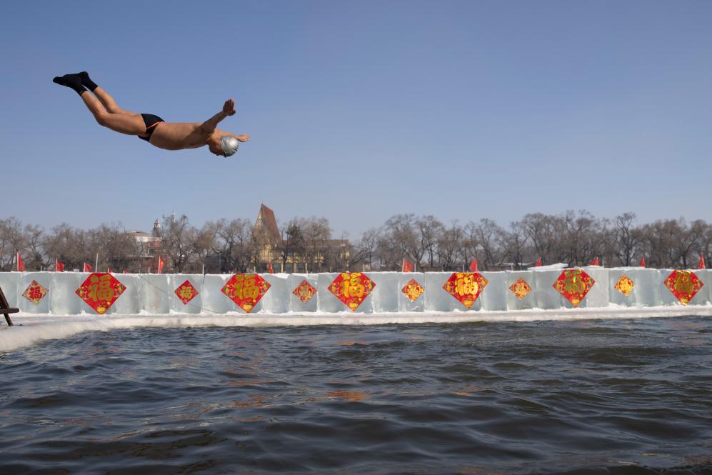 2022年1月31日,冬泳愛好者躍入松花江中。