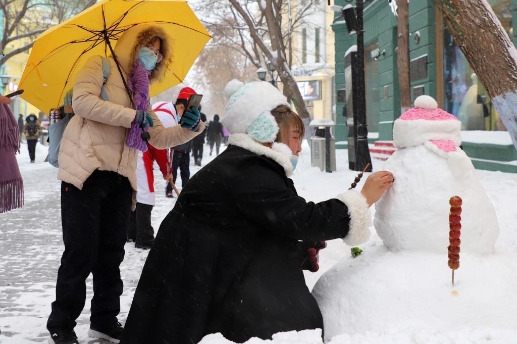 2020年11月19日,遊客在哈爾濱市中央大街堆雪人。