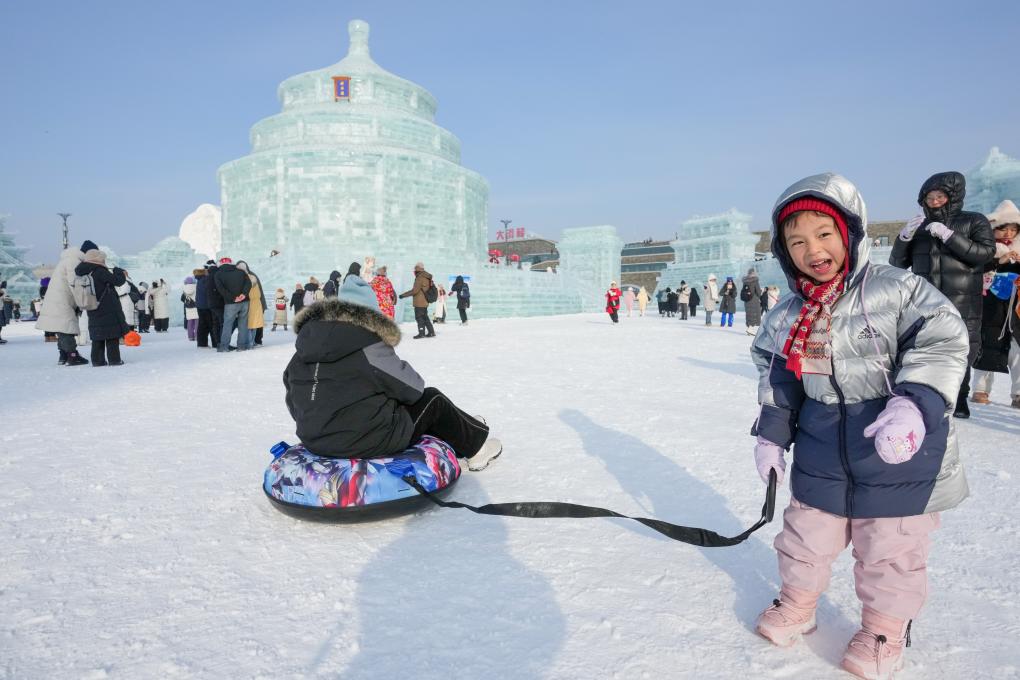2024年12月21日,小朋友在哈爾濱冰雪大世界園區拉雪圈。