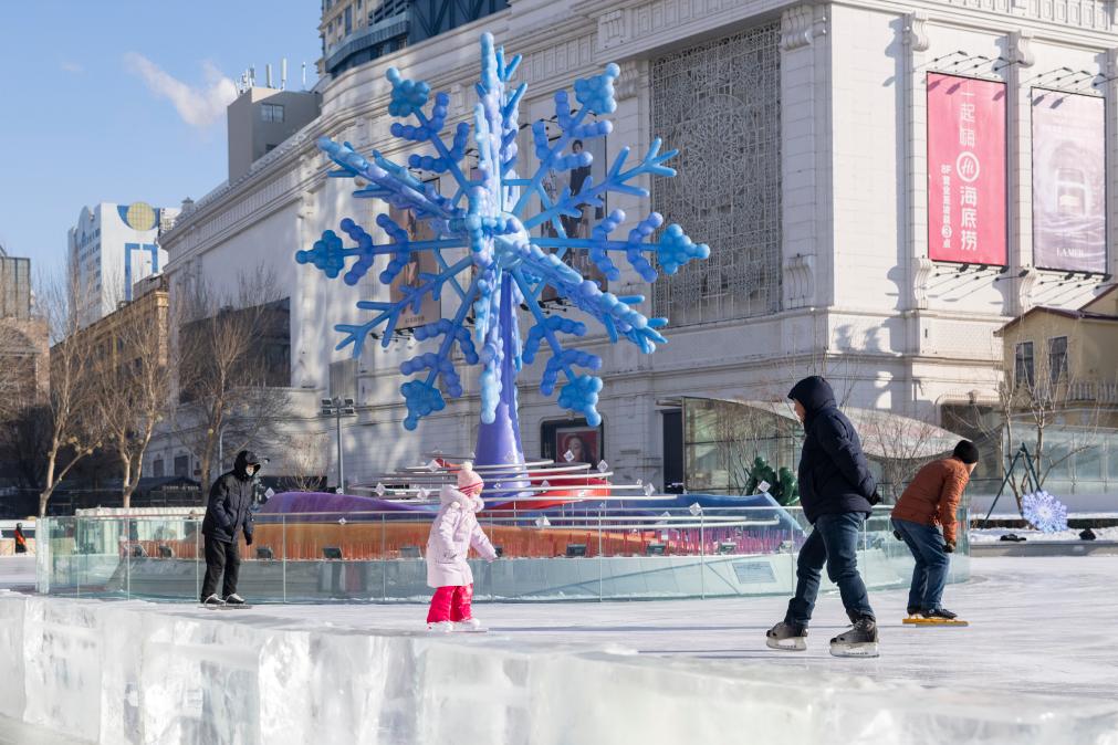 2025年1月4日,在哈爾濱市南崗區一處公益冰場,人們在“冰雪之冠”雕塑旁滑冰。
