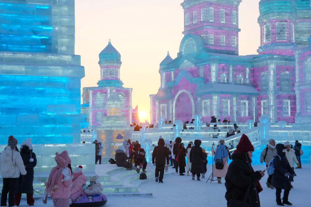 2025年1月23日,夕陽下,遊客在哈爾濱冰雪大世界園區內遊玩、拍照。