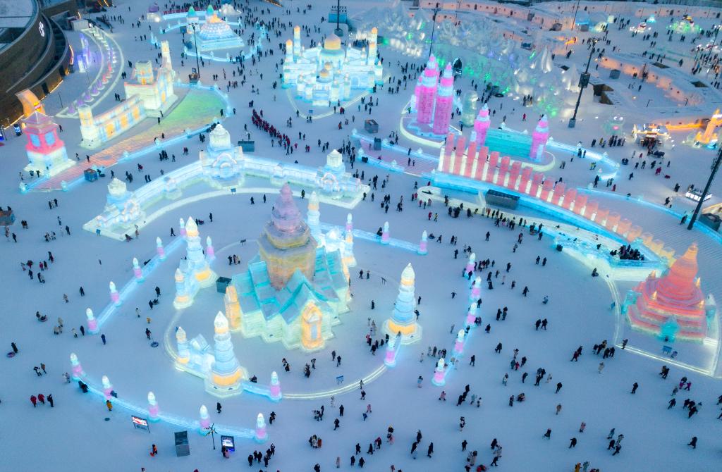 2025年1月5日,遊客在哈爾濱冰雪大世界園區內遊玩(無人機照片)。