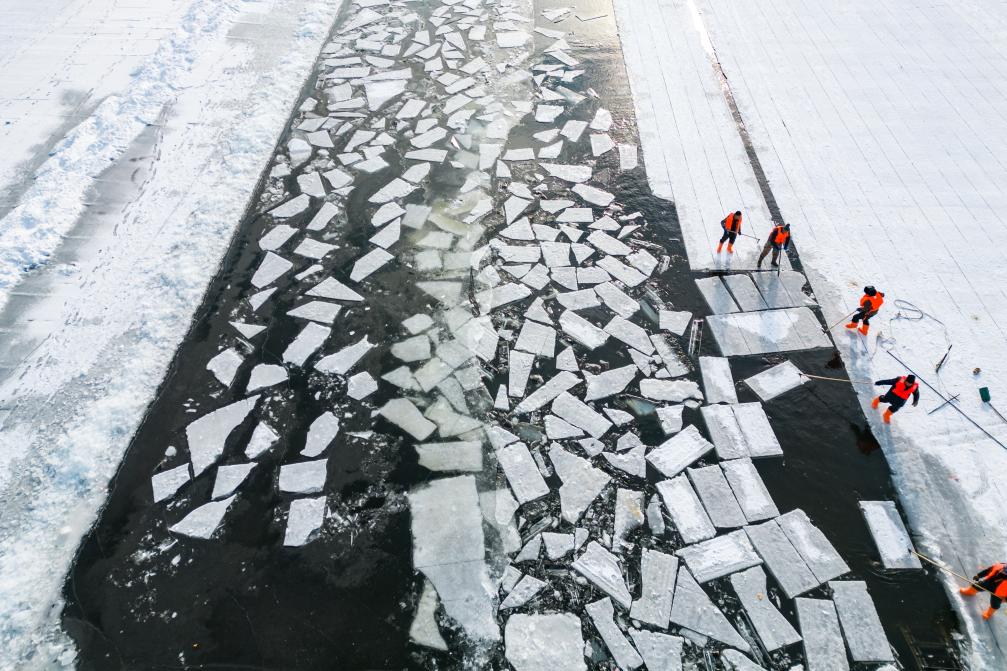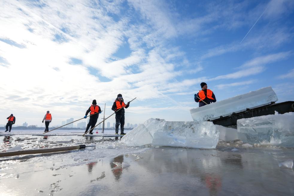 2024年12月9日,工人在松花江哈爾濱段採冰。