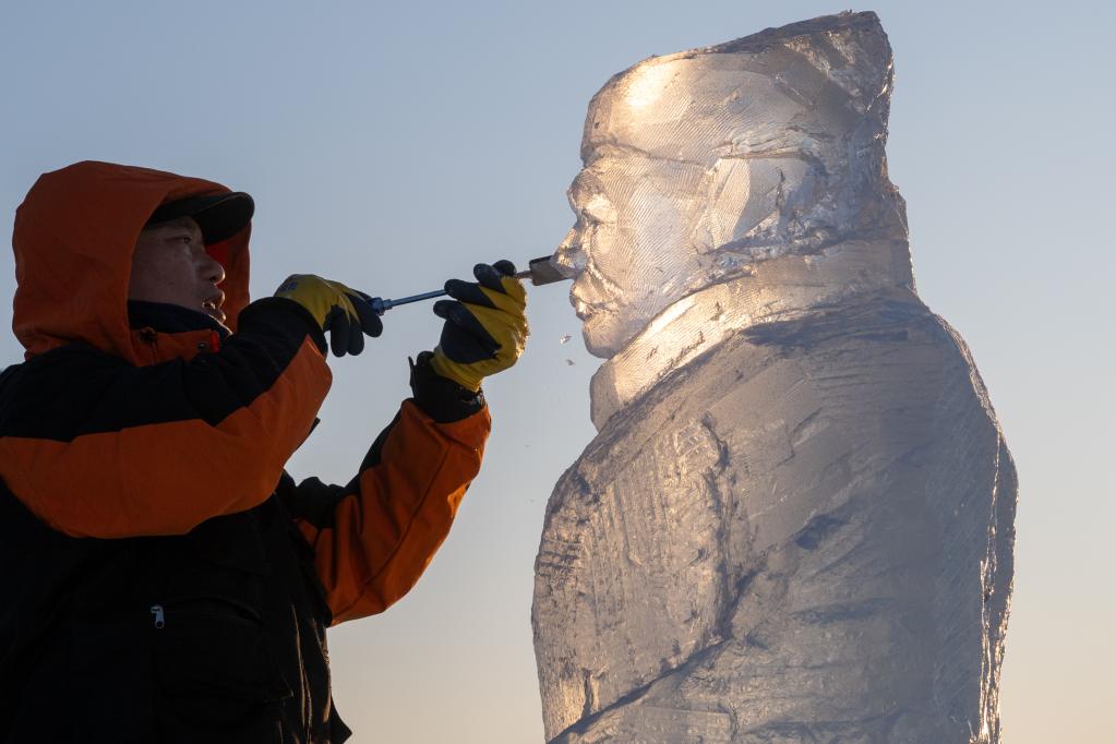 2025年1月4日,在哈爾濱冰雪大世界園區,大慶師范學院美術與設計學院冰雕團隊的成員在雕刻“冰馬俑”。