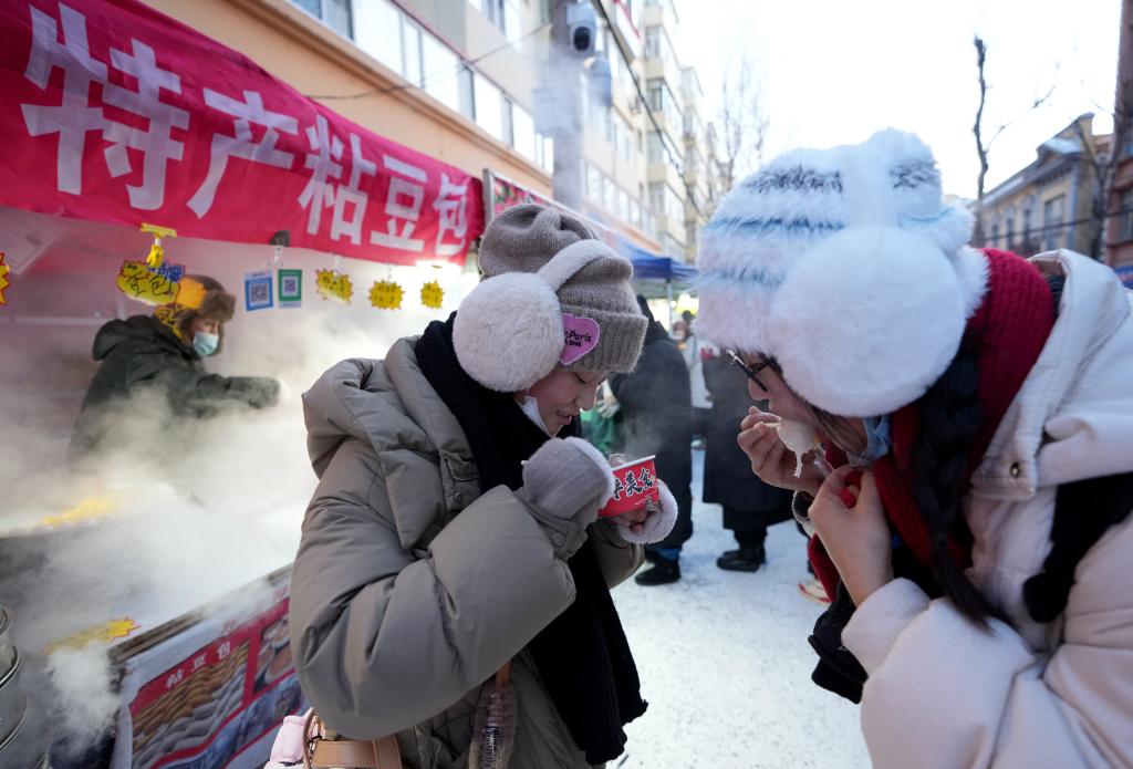 2024年1月22日,在哈爾濱紅專街早市,來自上海的遊客在品嘗粘豆包。