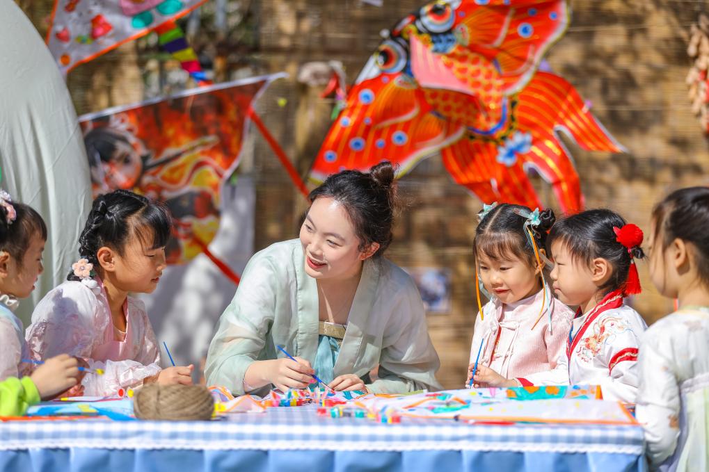 4月2日,在山東省青島市李滄區青峰路幼兒園開展的迎清明活動中,老師指導小朋友繪制紙鳶。