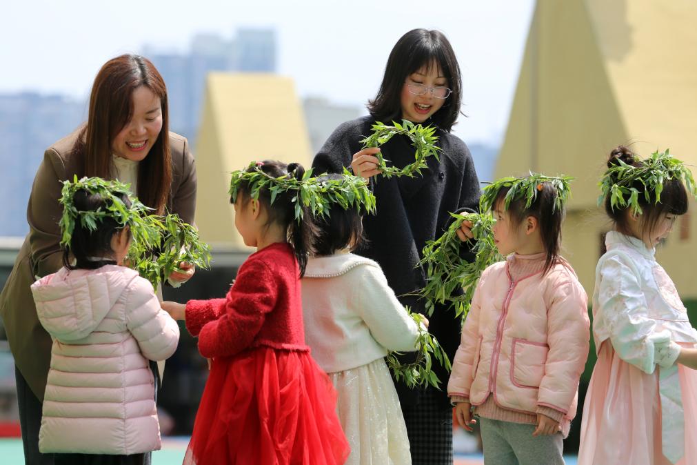 4月2日,在山東省青島市李滄區青峰路幼兒園開展的迎清明活動中,老師指導小朋友編柳帽。