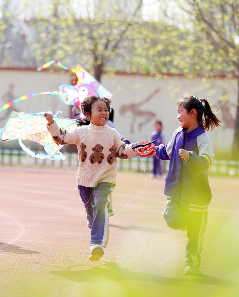 4月2日,學生們在山東省青島市市北區普新小學開展的民俗迎清明活動上放風箏。