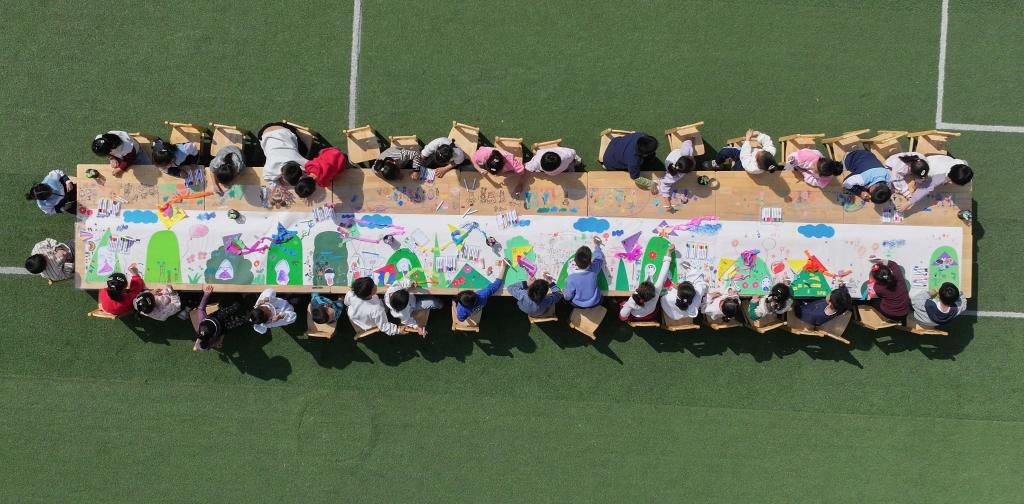 4月3日,山東省鄒平市高新街道中心幼兒園的小朋友在繪制清明長卷(無人機照片)。