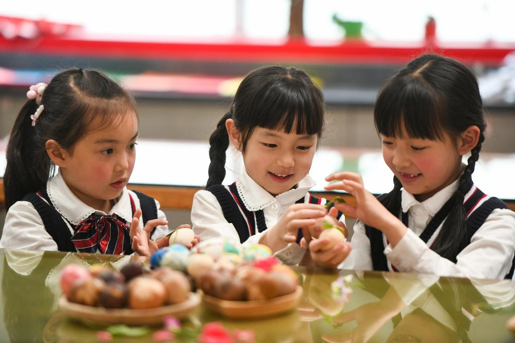 4月3日,在浙江省金華市婺城小學,小學生在制作清明花草蛋。