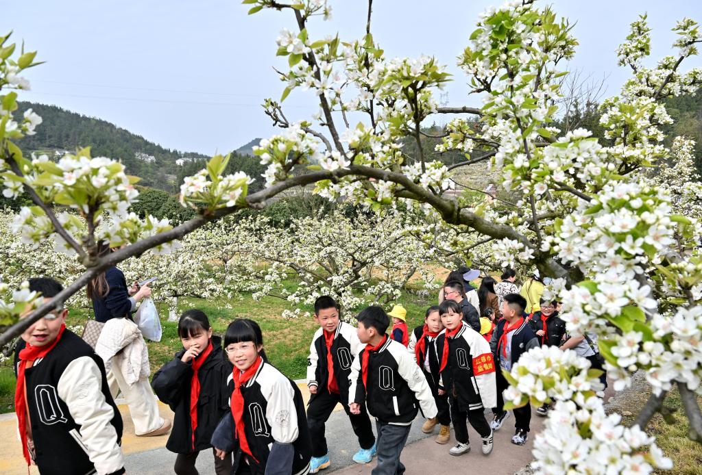 4月2日,湖北省宣恩縣清江外國語學校的師生在黃坪村的梨園里徒步。