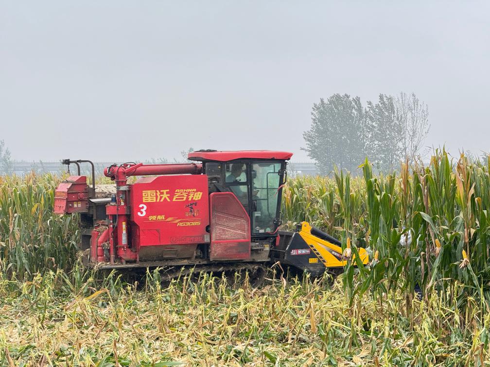 2025年10月11日,在安徽省淮北市濉溪縣百善鎮張莊村,從河南駐馬店調運過來的履帶式收割機在收割玉米。新華社發(徐弘揚 攝)
