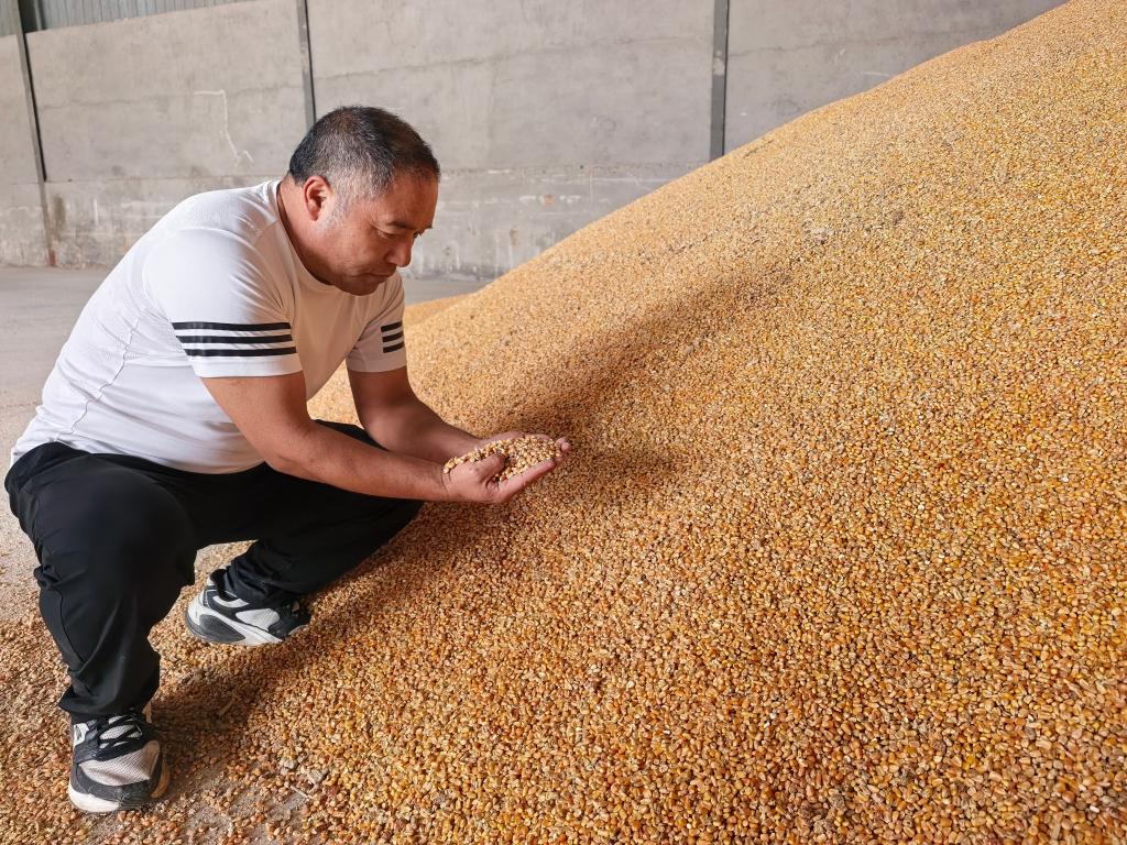 2025年10月10日,在安徽省宿州市蕭縣劉套鎮,三大家村黨總支書記高傑查看剛烘好的玉米。新華社記者 水金辰 攝