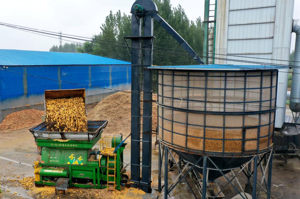 2025年10月10日拍攝的河北省衡水市阜城縣古城鎮一家糧食烘幹企業作業現場(無人機照片)。新華社發(崔賢飛 攝)