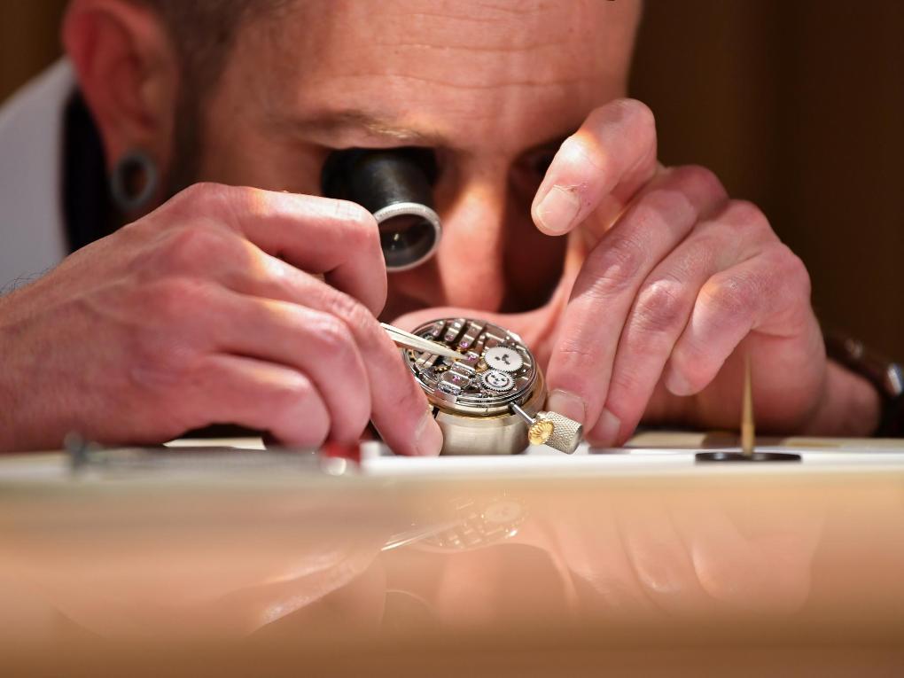 4月1日,在瑞士日內瓦舉行的“鐘表與奇跡”高級鐘表展上,工匠展示鐘表修復工藝。新華社記者連漪攝