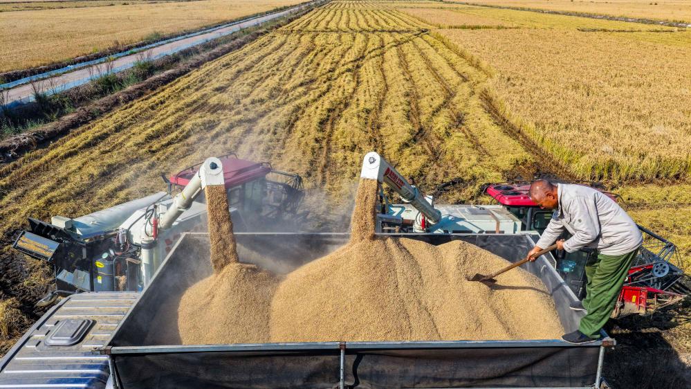 10月27日,河北省唐山市海港經濟開發區王灘鎮農民將收獲的稻谷裝車,準備運出稻田晾曬(無人機照片)。新華社發(劉滿倉 攝)