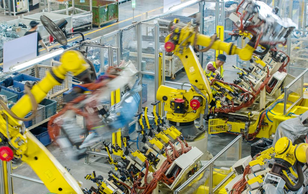 2025年10月9日,浙江省湖州市長興經濟技術開發區的長興地通汽車部件有限公司技術人員操控工業機器人生產新能源汽車配件(無人機照片)。新華社發(譚雲俸攝)