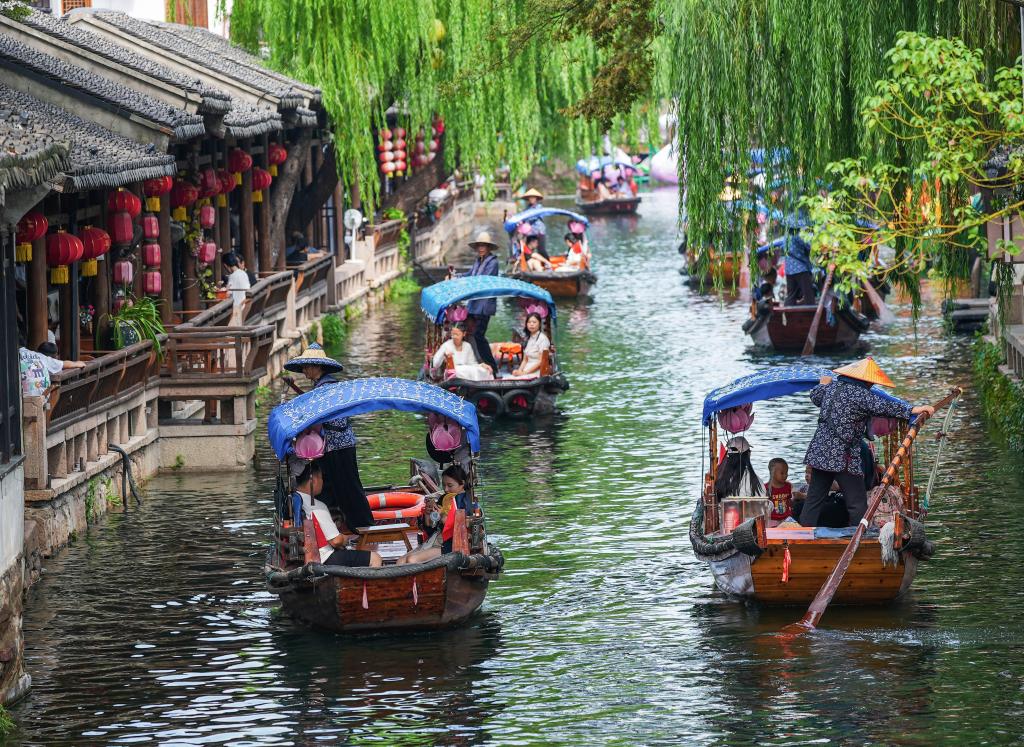 10月5日,遊客在江蘇省昆山市周莊古鎮遊覽。國慶中秋假期,各地群眾選擇多種方式出遊賞景、放松休閒,歡度“雙節”。新華社發(周社根攝)