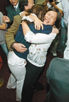 臺“立法院教育及文化委員會”上午排定審查陸生來臺相關“法案”,擔任會議主席的國民黨籍民意代表趙麗雲(左)要宣布會議開始,卻被民進黨籍民代管碧玲(右)用力抱住,兩人抱成一團,表情痛苦。圖片來源:臺灣《聯合報》