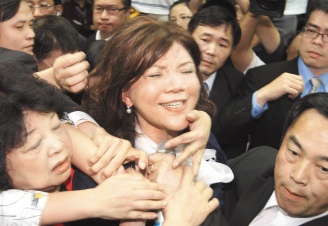 民進黨“立法院”黨團一早就佔據“教育及文化委員會”阻撓會議進行,民進黨籍民代用手捂著會議主席趙麗雲(中)的嘴。圖片來源:臺灣《聯合報》