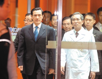 臺灣地區領導人馬英九(左)昨晚赴臺大醫院探視國民黨籍趙麗雲,他神情凝重,譴責民進黨暴力幹擾議事。圖片來源:臺灣《聯合報》