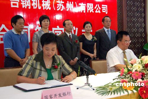 資料圖片:9月28日,國家開發銀行與臺鋼機械(蘇州)有限公司(前右)貸款合同正式簽署。臺鋼機械是獲得國家開發銀行首筆貸款的蘇州首家臺資中小企業。國家開發銀行還將在未來5年內向臺資企業提供300億元的貸款,積極解決臺資企業特別是中小臺商的融資難題,共同促進海峽兩岸經貿交流的發展,造福兩岸同胞,發展兩岸關係。 中新社 邱勇 攝