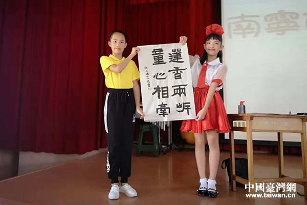 交流團先後拜訪花蓮明恥小學、花蓮北濱小學、臺北興雅小學,與學校師生同臺表演,聯誼交流,以歌會友,以舞傳情。活力四射的街舞表演、曲調歡快的廣西民歌聯唱、婉轉悠揚的葫蘆絲獨奏、優雅悅耳的鋼琴演奏,以及贈送的書畫作品,展示了邕城青少年的多才多藝,帶給臺灣小夥伴視聽享受,處處躍動著 “蓮香兩岸,童心相牽”。臺灣各校的同學們表演了民樂、武術、合唱等精彩節目歡迎交流團的到來。雙方同學歡樂互動,共同撞響“明恥之鐘”,共同書寫“意向書法”,共同唱響《稻香》、《青春修煉手冊》等膾炙人口的流行歌曲。臨別時,同學們紛紛與臺灣同學結對子,邀請他們到南寧做客,互相擁抱,依依惜別。
