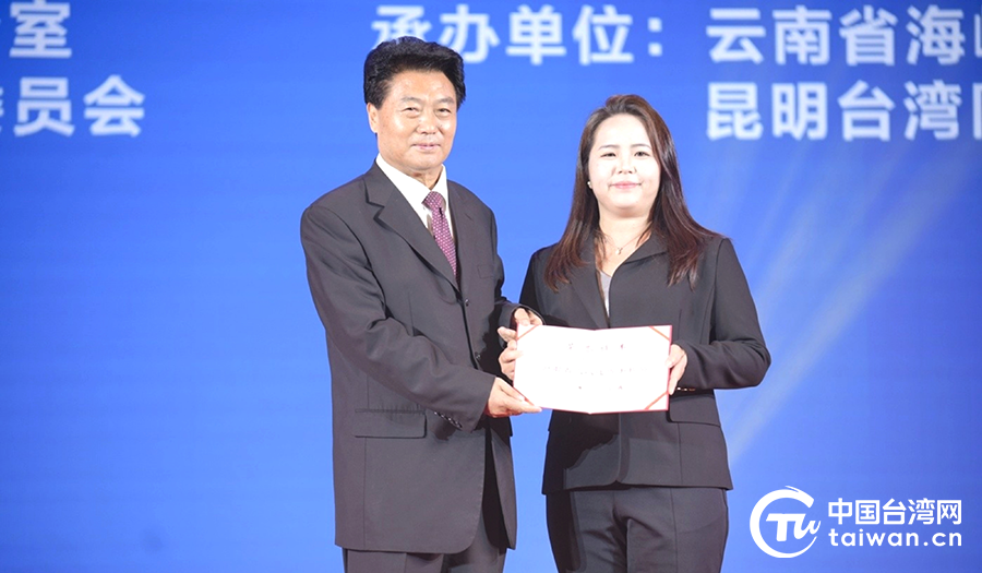 雲南省政協副主席和良輝(左)為榮獲雲南省三八紅旗手的臺灣青年頒發證書(中國臺灣網發)