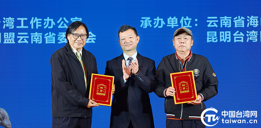 雲南省委臺辦主任鄧恆源(中)頒發雲臺兩地文化交流藝術顧問聘書(中國臺灣網發)