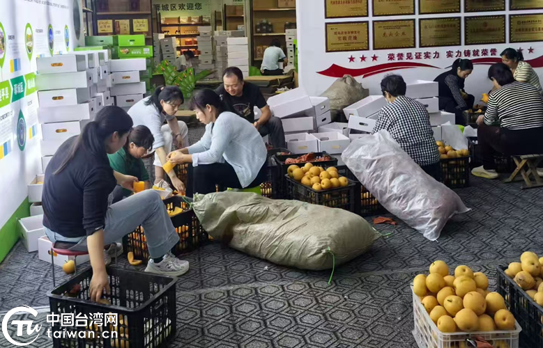臺胞志願者們與農人們共同分裝滯銷的秋月梨。(中國臺灣網發)