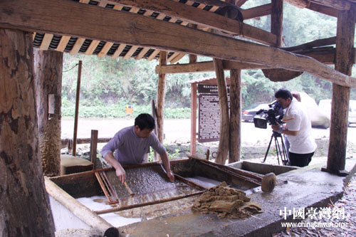 位于古韻·隴腳的香紙溝,溝谷深切,峰巒疊嶂,瀑布飛流。這里不僅有著迷人的高原峽谷風光,濃鬱的布依風情。最令人稱奇的是景區內保存著目前大陸規模最大,最集中的古法蔡倫造紙作坊係統。當地布依同胞就地取材,以竹為料,從伐竹、破竹、蒸竹、漚竹、水車碾竹、竹簾抄紙等72道工藝流程、均顯得古樸而奇特,這是中華文化的一種遠古文明,也是一個奇跡,一個秘密。圖為攝制組拍攝香紙溝古法造紙。(貴陽市臺辦 胡珊珊 攝)