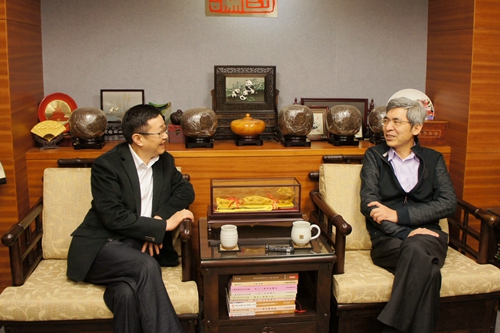 四川省臺辦副巡視員楊志學(左)與臺灣中評社俞雨霖社長交談。