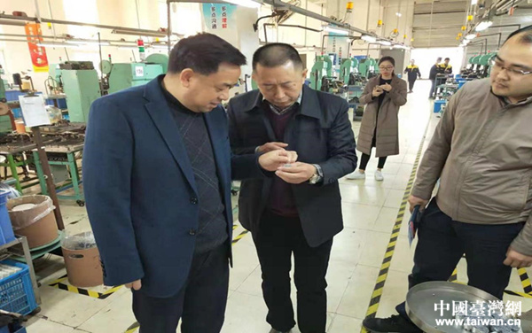 達州市臺辦副主任李仕林(左一)一行走訪企業車間。(圖片來源:達州市臺辦)