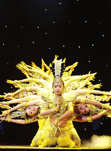 《千手觀音》的表演者邰麗華和她的夥伴們,是聽不到舞蹈提示節拍的,但她們編導和老師創造了聾人舞者舞蹈的獨特規則——呼吸,來達到整齊劃一的完美表演。在整個舞蹈動作的手語指揮中,手語老師一直都在跳著幾乎和演員們一樣的動作:伸手呼氣,收手吸氣。你會驚嘆演員的動作整齊劃一,驚嘆手語老師和演員的步調統一。老師和演員們通過呼吸這一規則來達到動作的一致。昨晚出現在成都觀眾眼前的“千手觀音”,珠光閃爍,美不可言,每個動作都整齊美妙得令人屏住呼吸。“只要心中有善,有愛,你就願意伸出一千次手去幫助別人,而也會有一千只幫助的手伸向你”——這就是《千手觀音》所詮釋出的生命真諦,當邰麗華最後用手語“說”出這句話,而舞臺兩側的大屏幕也打出這句創作主題詞時,觀眾們的掌聲再一次沸騰。
