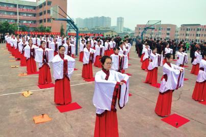 “丙申年三月十六,公歷2016年4月22日。內江市第三中學100名學子在此舉行漢式冠笄成人禮……”在讚禮宣讀的同時,100名身穿漢服的學生從操場後方緩緩走來,女生手持束帶和發簪,男生手持冠帽。