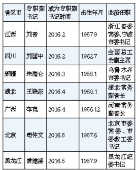 河北、吉林、湖北、廣西、貴州、西藏6省區的專職副書記此前都擔任副省長,特別是常務副省長一職。近期任廣西壯族自治區黨委副書記的李克此前擔任河南常務副省長,其他5地的專職副書記都從本省副省長崗位上調任,如吉林省委副書記馬俊清原為吉林省常務副省長。